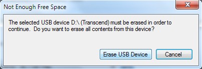 Program ostrzeże nas o konieczności wykasowania zawartości nośnika. Potwierdzamy przyciskiem Erase USB Device.