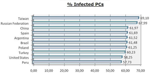 Według Panda Security w stosunku do poprzedniego miesiąca, liczb zainfekowanych komputerów wzrosła o 15%. Średnio 59% komputerów na całym świecie jest zakażonych.