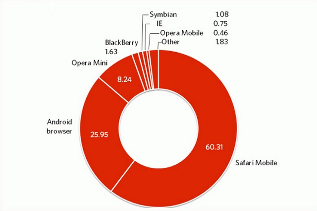 W segmencie przeglądarek mobilnych liderem pozostaje mobilna wersja Safari oraz przeglądarka systemowa Androida z udziałami 60,31 oraz 25,95 procent odpowiednio. Pierwszą trójkę zamyka Opera Mini z wynikiem 8,24 procenta.