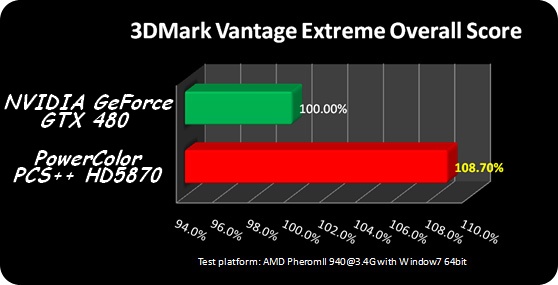 Wspomniałem wcześniej, że PowerColor PCS++ HD5870, to karta graficzna w wersji Super Overclocked. Potwierdza to niewątpliwie częstotliwość taktowania procesora graficznego, którą zawyżono z domyślnej wartości 850MHz układu referencyjnego do niebotycznych 950MHz. Specyfikację pamięci wideo pozostawiono bez zmian. To wciąż 1024MB w standardzie DDR5 z 256-bitową szyną dostępu i rzeczywistą częstotliwością taktowania na poziomie 1200MHz (efektywne 4800MHz). Zawyżona wartość procesora GPU przyczyniła się do zwiększenia poboru mocy przez kartę, choć ta i tak na wydajność, jaką oferuje karta jest znikoma, a wynosi przy obciążeniu 250W.