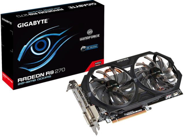 Swoje warianty podkręcone do 950-975 MHz pokazały także firmy HIS z modelem R9 270 IceQ X2, Gigabyte GV-R9270OC-2GD (na zdjęciu) z chłodzeniem Windforce 2X oraz MSI.