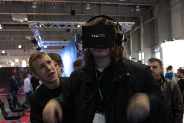 Oculus Rift . Urządzenie to wzbudziło wielkie zainteresowanie zwiedzających jak i nasze. Testowaliśmy Oculusa na demie kolejki górskiej. Odczucia były identyczna jak by się rzeczywiście było w wagoniku, podczas testowania miał szansę odczuć też lekkie skurcze mięśni brzucha a także nóg, lekkie kiwanie się na boki było standardowym odczuciem każdego testującego Oculusa, mimo że nadal stało lub siedziało się w jednym miejscu. Gogle oraz słuchawki były bardzo wygodne i naprawdę można było się poczuć jak by się tam było. Moim zadaniem to była najciekawsza rzecz na ca całych targach.