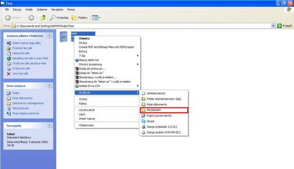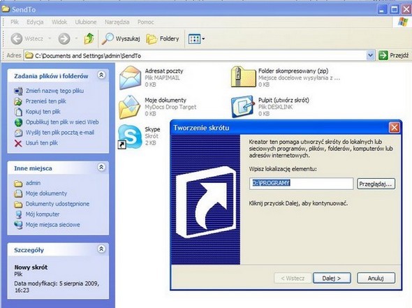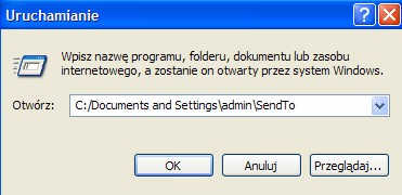 1. Z menu start wybrać polecenie uruchom i wpisać ścieżkę do folderu odpowiadającego za zawartość listy domyślnie jest to: X:\Documents and Settings\nazwa użytkownika\SendTo