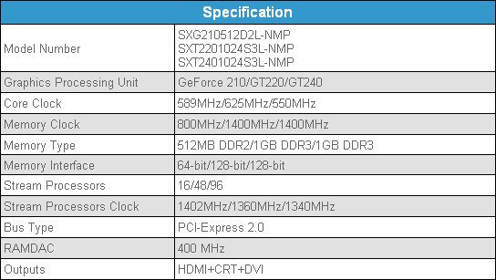 Specyfikacja techniczna nowych, chłodzonych pasywnie kart Sparkle GeForce 210, GT220, GT240 nie zmieni się w stosunku do ich pierwowzorów. W nowej odsłonie nacisk położono na całkowitą ciszę (0 decybeli) podczas pracy poszczególnych modeli, przez co karty powinny znaleźć z łatwością swoje miejsce w komputerach typu HTPC (Home Theater Personal Computer) pełniących rolę centrum multimedialnego w zaciszu domowym, gdzie miarą wydajności są filmy standardu High Definition, a nie wymagające gry.
