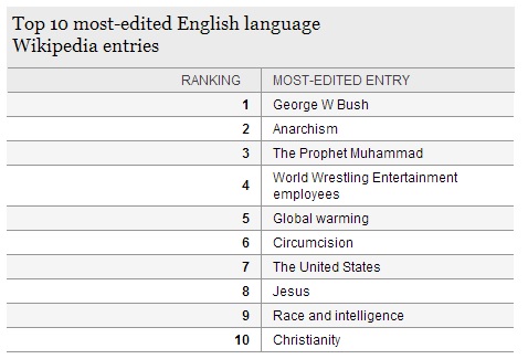 Naukowcy opublikowali top 10 najczęściej edytowanych stron, wśród nich znalazły się hasła anarchizm, prorok Mahomet oraz Jezus.
