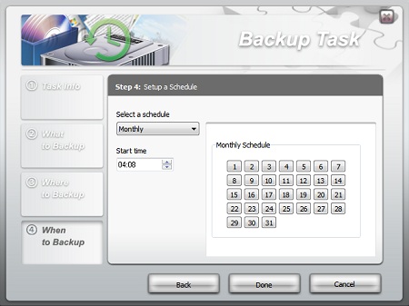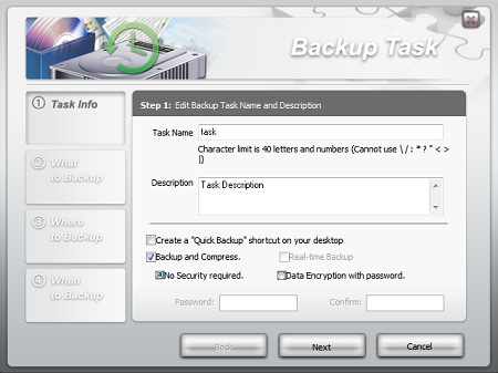 Tworzenie kopii zapasowej odbywa się w 4 prostych krokach, tworzymy nowe zadanie wpisując nazwę oraz opis zadania. Jeżeli dane kompresujemy możemy zabezpieczyć je hasłem.