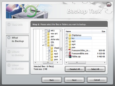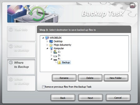 W kolejnym kroku wybieramy pliki, które chcemy zarchiwizować, dalej wybieramy ścieżkę gdzie pliki zostaną zapisane. Kopia zapasowa może być tworzona regularnie, możemy wybrać z jakim odstępem czasowym ma być wykonywana. Po zakończeniu konfiguracji możemy od razu przystąpić do tworzenia kopii lub poczekać na pierwsze automatyczne kopiowanie.