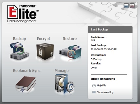 JetFlash Elite to oprogramowanie do tworzenia kopii zapasowych, przywracania danych z kopii, synchronizacji zakładek internetowych oraz szyfrowania danych. Do jego uruchomienia niezbędne jest podłączenie pendrive’a do komputera.