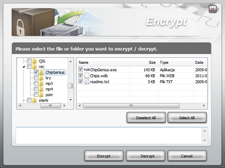 Dane na pendrive’ie możemy zabezpieczyć szyfrując wybrane katalogi lub pliki. Po naciśnięciu przycisku Encrypt wyskoczy nam okienko w którym należy podać hasło. Deszyfrowanie odbywa się analogicznie poprzez opcję Decrypt.