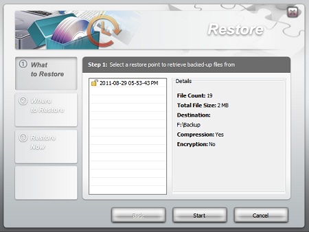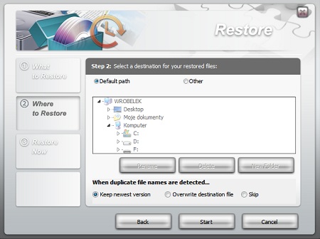 W przypadku zmian, zagubienia, wykasowania plików możemy je przywrócić z wcześniej utworzonej kopii zapasowej. W zakładce Restore wybieramy z której kopii zapasowej chcemy przywrócić pliki.