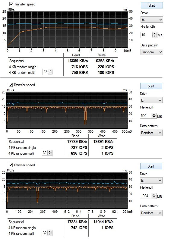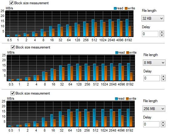 Test w przypadku mniejszych plików wypadł nieco gorzej niż w przypadku plików dużych. Dla małych plików (10MB) w testach karta uzyskała transfery 6 MB/s dla zapisu oraz 16 MB/s dla odczytu. Większe pliki powyżej 500 MB uzyskały większy transfer dla zapisu wynoszący 13MB/s oraz lekko poprawiony transfer dla odczytu około 18MB/s.