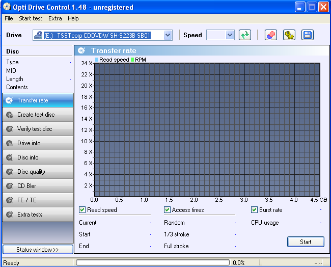 3. Przed rozpoczęciem testu wkładamy czystą płytę do naszego napędu i zaznaczamy w bocznym menu opcję Transfer rate która sprawdzi realny transfer naszego napędu,klikamy start aby rozpocząć test.