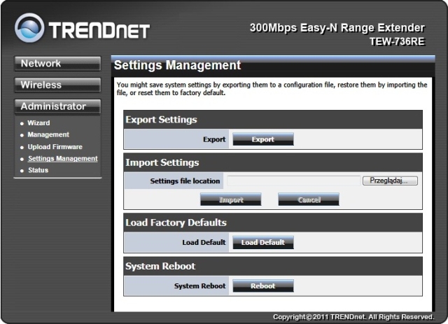 Na stronie konfiguracyjnej dostępne są opcje administratorskie, w których można uruchomić kreator ustawień, zmienić hasło dostępowe do urządzenia, zmienić jego nazwę wyświetlaną w sieci, wgrać nowy firmware, zapisać ustawienia do pliku czy też załadować ustawienia z pliku, przywrócić ustawienia fabryczne, zresetować urządzenie oraz wyświetlić status urządzenia.