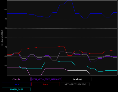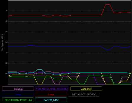 Na koniec wykresy mocy sygnałów na poszczególnych piętrach domu. Domowy router widnieje jako sieć Lena o kolorze niebieskim, a repeater jako sieć Lena o kolorze czerwonym. Pierwszy pomiar przy domowym routerze. Sieć domowa posiada mocny sygnał w granicy od -30 do -40 dBm. Natomiast repeater emituje sygnał o mocy -70 do -80 dBm. Być może problem tkwi w skierowaniu anten, gdyż tutaj faktycznie jesteśmy pod repeaterem, gdzie jego anteny rozgłaszają sieć na piętrze i strychu.