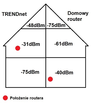 Na koniec pomiar wykonany na strychu repeater (różnica 1 piętro) posiadał siłę sygnału w przedziale od -45 do -55 dBm. Domowy router (2 piętra niżej) posiadał siłę sygnału w przedziale od -70 do -80 dBm. Tym samym repeater pozwolił na skuteczne rozszerzenie sieci o dwie kontygnacje domku jednorodzinnego i patrząc na wyniki można by było korzystać z sieci jeszcze o piętro, dwa wyżej.
