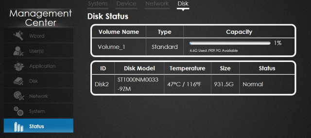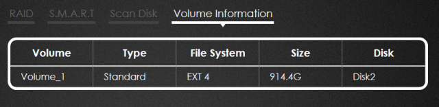 Kolejna zakładka to informacja o podłączonych dyskach. Warto zauważyć, że prezentowany NAS działa z dyskami formatowanymi do EXT4.