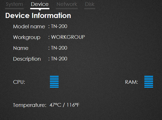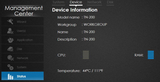 Zarządzając TN-200 warto też czasami odwiedzić okno statusu urządzenia, w tym jakie jest zużycie zasobów czy też czy sprzęt się nie grzeje zbyt mocno. W statusie możemy także zobaczyć jakie jest aktualne wykorzystanie miejsca na dysku.