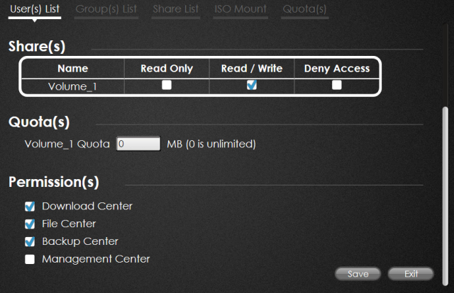 Użytkownikom można przydzielać wybrane prawa dostępu, w tym do samego dysku jak i do wybranych opcji panelu sterowania.