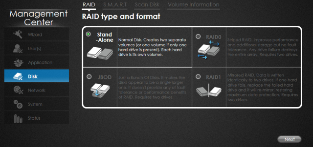 Prezentowany NAS posiada dwie kieszenie na dyski twarde. Dyski te mogą pracować w RAID0 czy RAIDI, więc dla każdego coś miłego się znajdzie.