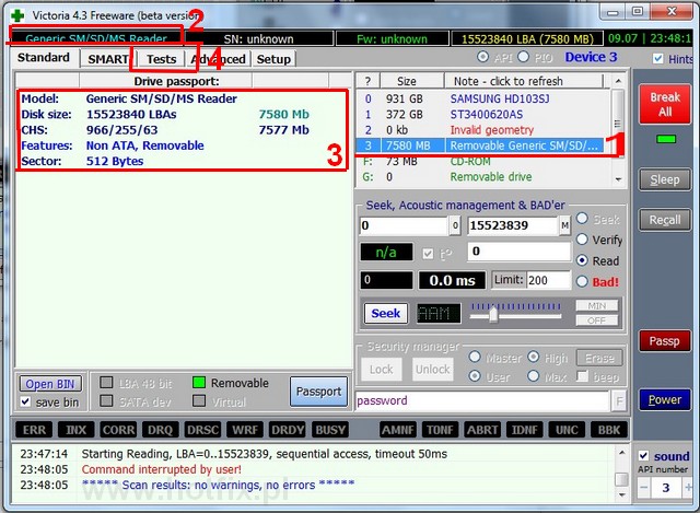 Zaczynamy od wyboru naszego dysku lub pamięci . Pomoże nam w tym jego rozmiar (Size) oraz litera dysku i/lub jego nazwa. Ja wybierałem skanowanie karty SD, więc w nazwie miałem SD . Jeżeli ją wybierzemy, w sekcji 2 powinna się pojawić ta sama nazwa, zaś w części głównej okna 3 jego szczegółowe dane.