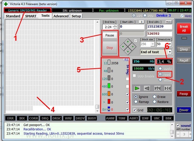 Dopiero wtedy przejdź do testów, w części 2 wybierz Read, ewentualnie Verify. Wtedy w sekcji 3 kliknij Start. Rozpocznie się test, który w każdej chwili można wstrzymać (Pause) lub całkowicie zakończyć (Stop).