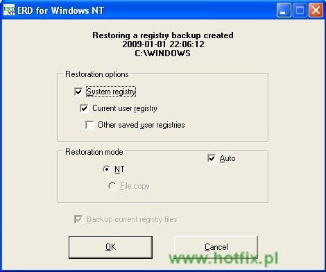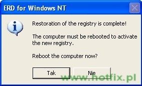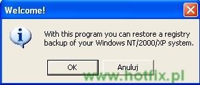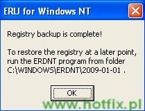Aby przywrócić wykonaną uprzednio kopię rejestru, wejdź do folderu z kopią i uruchom program ERDNT.EXE. Pojawi się okno mówiące, że tym programem możesz wykonać przywracanie rejestru.