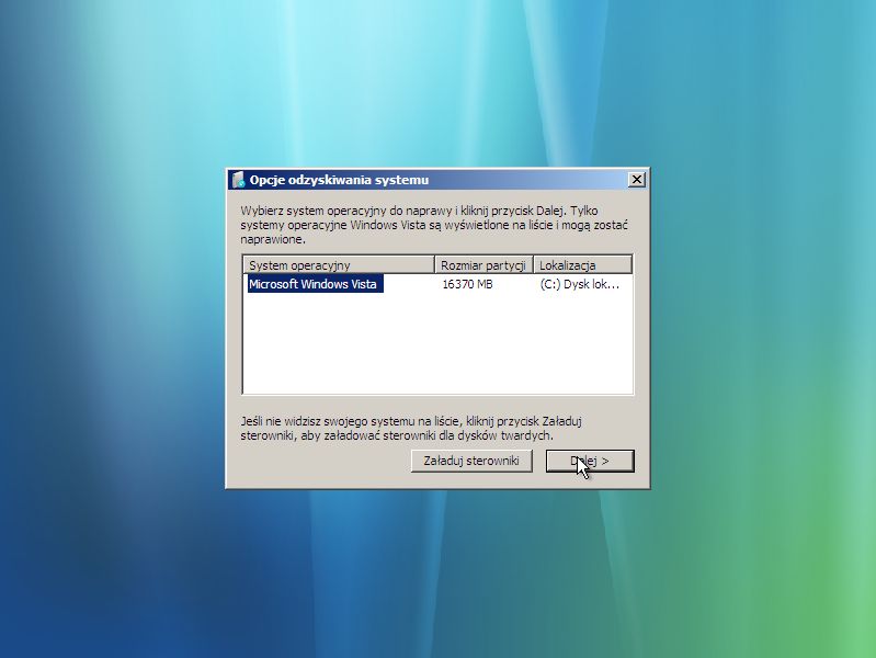 Tutaj możemy wybrać system, który chcemy odzyskać. Nie musimy tego robić, gdyż możemy kliknąć na wolnej przestrzeni pod wyświetlonymi systemami, powodując odznaczenie wybranego systemu. Na tym etapie możemy także załadować potrzebne nam sterowniki. Po wybraniu odpowiedniej opcji (systemu) klikamy Dalej.