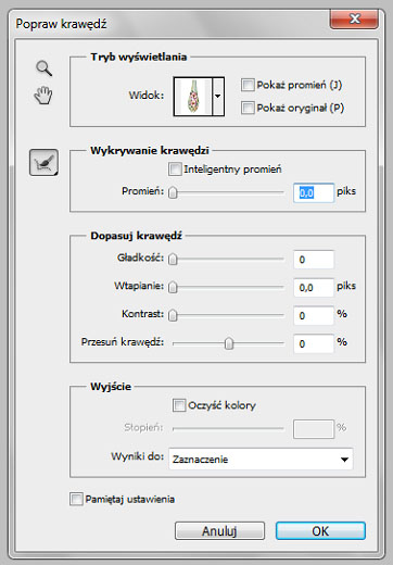 4. Standardowo czyścimy tło za pomocą klawisza delete. Dodam, że jeśli nasze kontury, są zbyt ostre, tak jak w przypadku lassa magnetycznego, możemy użyć opcji "Popraw krawędź"