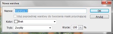 Możemy ustawić nazwę warstwy, kolor (opcjonalne, zmienia kolor w menu warstw), tryb oraz stopień krycia. Proponuje zostawić wszystkie właściwości domyślnie.