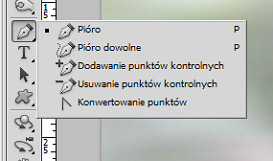 1. Wybieramy pióro (pen tool) z menu narzędzi. Po przytrzymaniu ikonki ukaże nam się lista dostępnych opcji