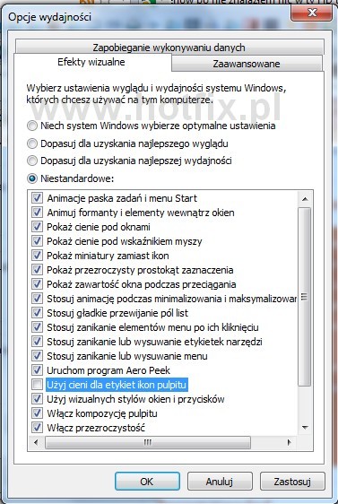 W efektach wizualnych odznaczamy "Użyj cieni dla etykiet pulpitu".