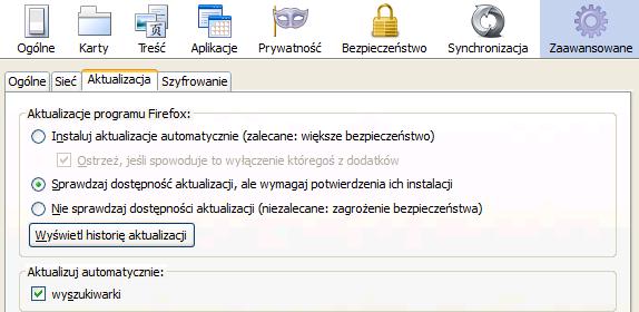 W Firefox -> Narzędzia -> Opcje -> Zaawansowane -> Aktualizacje. Dalej ustawiamy wszystko tak, jak na obrazku poniżej: