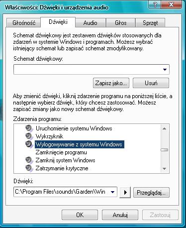 Dźwięki Windowsa 7 możemy pobrać stąd . Wybierz sobie motyw dźwiękowy. Dźwięki zastosujesz w panelu sterowania -> Dźwięki i urządzenia audio. Przejdź w zakładkę Dźwięki. Zaznacz jakiś dźwięk np. wylogowywanie z systemu Windows. Klikasz przeglądaj i wybierasz plik audio, w tym przypadku logoff.