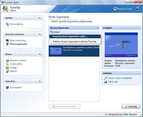 3. Tym razem w TuneUp Styler przejdź w zakładkę Ekran logowania. Kliknij dodaj i Importuj ekran logowania z pliku...