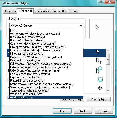 Kursory w siódemce się trochę różnią od tych z xp. Można je pobrać stąd. Wypakowujesz zawartość do tymczasowego folderu. Plik Readme nie musi być w katalogu. Klikasz prawym przyciskiem na Install.inf i zainstaluj. Od teraz kursory będą zainstalowane. Teraz należy je zastosować. W tym celu przejdź do panelu sterowania, wybierz mysz i przejdź do zakładki wskaźniki i wybierz ostatnio dodane kursory, następnie kliknij zastosuj.