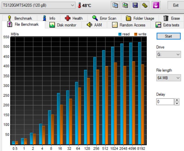 Zgodnie z testem w HDTune Pro dysk zbliża się do swojej granicy maksymalnej wydajności w odczycie dając transfer około 525 MB/s. Zdecydowanie gorzej wypada mu zapis, gdzie ma on maksymalnie 425 MB/s. Należy tu pamiętać, że producent mówi nawet o 500 MB/s dla zapisu. Trochę brakuje.