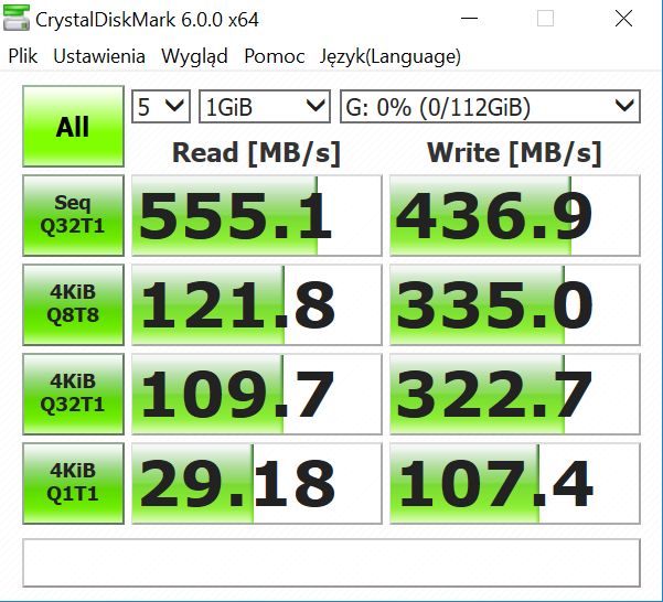 CrystalDiskMark pokazał chyba szczyt możliwości tego dysku. Odczyt wyniósł prawie idealne 550 MB/s co jest tylko o 5MB/s gorsze od deklarowanego. Zapis tutaj też był najlepszy i wynosił 437 MB/s. Deklarowanej 500-tki nie osiągnięto w żadnym z testów. Warto tutaj zauważyć, że transfery blokowe są całkiem dobre.
